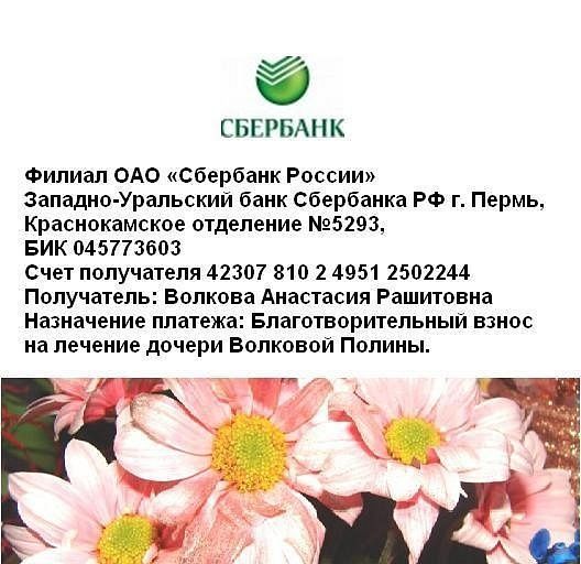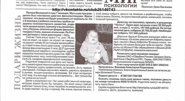 Мила Кузьмина 0 Опубликовано 11 Июля 2011 Жалоба Поделиться Опубликовано 11 Июля 2011 (изменено) Дорогие друзья! Обращаемся к ВАМ, успешным и добрым людям! Будьте добры, проникнетесь к судьбе малышке, которая живет рядом с ВАМИ! Протяните руку помощи! Может от ВАШЕГО участия жизнь малышки изменится к лучшему!!!!Полине Волковой из Краснокамска при рождении был поставлен диагноз фенилкетонурия. Врачи сказали, что девочка будет развиваться нормально. Но с 6 месяцев у ребенка началась грубая задержка психомоторного развития. Начали искать причину, и выяснилось, что у Полины атипичная форма фенилкетонурии 3 типа. Сейчас Поле 2года 7 месяцев - вес всего 7 кг, рост 78 см, она не ходит, не сидит, не играет, не говорит. В настоящее время ребенку ставят много диагнозов Фенилкетонурия, ДЦП, эписиндром, грубая задержка психомоторного развития. Для лечения требуется много денег для непосредственного диагноза, жизненно необходимы лекарства, которые в России не продаются. Родители заказывают их из Швейцарии. Самостоятельно, без участия других людей, ребенку не помочь. А как хочется маме и папе и всем родным не только поддерживать жизнь ребенка, но и поставить ее на ножки, чтобы она была как все: научилась ходить, играть, разговаривать! Вы не представляете, как хочется маме услышать слово "МАМА" из уст Поленьки, но денег хватает только на лекарства, которые поддерживают жизнедеятельность малышки.Мы - группа активных волонтеров, чем можем помочь в данном случае? Первое: проверили достоверность информации и создали в социальной сети группу http://vkontakte .ru/ club26149743, где размещена вся информация о малышке, контакты, все документы, подтверждающие личность мамы и ребенка, выписки из больницы, счет на реабилитацию и дорогостоящее лекарство. Больная малышка ждет Вашей помощи. Ее жизнь зависит от доброты успешных взрослых, нашей с вами доброты! В наших силах - подарить ей самое большое чудо на свете. Подарить ей Жизнь. СРОЧНЫЙ СБОР на реабилитацию - 52 350 руб., жизненно необходимый препарат тетрагидробиоптерин - 19 440 руб.,ИТОГО: 71 790 руб. СОБРАНО на 10.07.2011 г.: 60 099,49 руб.ОСТАЛОСЬ СОБРАТЬ: 11690,51 руб. Срок 28 июля 2011 г. Спасибо за то, что прочитали и узнали о Поленьке. Не думаю, что это письмо-обращение оставит вас быть равнодушным человеком.контактыАдрес: Пермский край, г. Краснокамск, ул. Чапаева, 57-23 дом. тел. (34 273) 48726 Телефон мамы Анастасии (моб) 8 908 252 88 48 Эл. адрес на mail.ru: anastasiya.volkova.83@mail.ru реквизиты: Филиал ОАО «Сбербанк России» Западно-Уральский банк Сбербанка РФ г. Пермь, Краснокамское отделение №5293, БИК 045773603 Счет получателя 42307 810 2 4951 2502244 Получатель: Волкова Анастасия Рашитовна Назначение платежа: Благотворительный взнос на лечение дочери Волковой Полины Телефон БИЛАЙН 89097315378 Оказать помощь малышке Поле можно, положив денежку на этот номер. Настя сможет их обналичить через банк Валютный счёт: VOLKOVA ANASTASIYA RASHITOVNA. MIRA STR. 9-65, PERM KRAY, RUSSIAN FEDERATION. BANK: SBERBANK (ZAPADNO-URALSKY HEAD OFFICE) PERM RUSSIA BR 5293 KRASNOKAMSK SWIFT SABRRUMMPC1 ACCOUNT NUMBER 42307 97824 95125 00188 Изменено 11 Июля 2011 пользователем Мила Кузьмина Ссылка на сообщение Поделиться на других сайтах